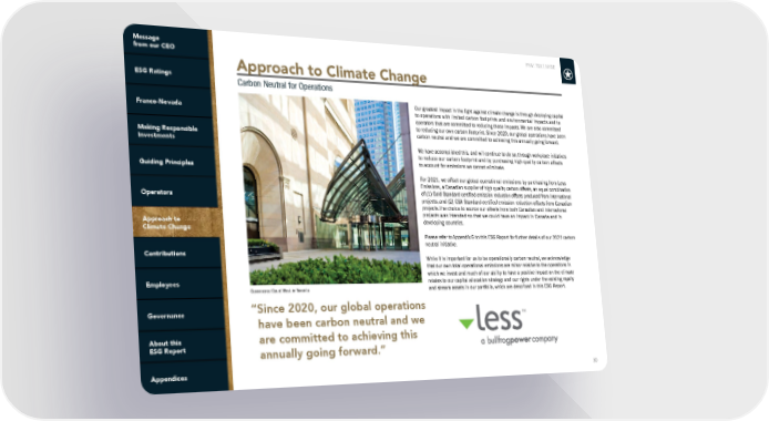 FNV: TSX | NYSE 30 Approach to Climate Change Carbon Neutral for Operations Our greatest impact in the fight against climate change is through deploying capital to operations with limited carbon footprints and environmental impacts and to operators that are committed to reducing those impacts. We are also committed to reducing our own carbon footprint. Since 2020, our global operations have been carbon neutral and we are committed to achieving this annually going forward. We have accomplished this, and will continue to do so, through workplace initiatives to reduce our carbon footprint and by purchasing high quality carbon offsets to account for emissions we cannot eliminate. For 2021, we offset our global operational emissions by purchasing from Less Emissions, a Canadian supplier of high quality carbon offsets, an equal combination of (1) Gold Standard-certified emission reduction offsets produced from international projects, and (2) CSA Standard-certified emission reduction offsets from Canadian projects. The choice to source our offsets from both Canadian and international projects was intended so that we could have an impact in Canada and in developing countries. Please refer to Appendix G to this ESG Report for further details of our 2021 carbon neutral initiative. While it is important for us to be operationally carbon neutral, we acknowledge that our own total operational emissions are minor relative to the operations in which we invest and much of our ability to have a positive impact on the climate relates to our capital allocation strategy and our rights under the existing royalty and stream assets in our portfolio, which are described in this ESG Report. TM “Since 2020, our global operations have been carbon neutral and we are committed to achieving this annually going forward.” Commerce Court West in Toronto
