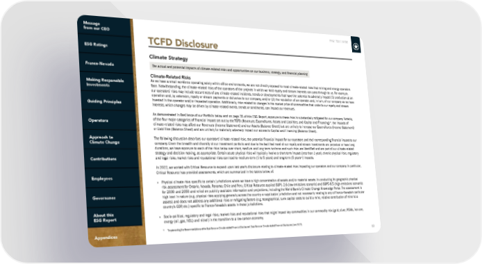 FNV: TSX | NYSE 83 TCFD Disclosure Climate-Related Risks As we have a small workforce operating solely within office environments, we are not directly exposed to most climate-related risks that mining and energy operators face. Notwithstanding, the climate-related risks of the operators of the projects in which we hold royalty and stream interests can pass through to us. For example, our operators’ risks may include occurrences of any climate-related incidents, trends or developments that have the potential to adversely impact (1) production at an operation and, by extension, royalty or stream payments or deliveries to our company, and/or (2) the reputation of an operator and, in turn, of our company as we have invested in the operator and/or impacted operation. Additionally, risks related to changes in the market price of commodities that underlie our royalty and stream interests, which changes may be driven by climate-related events, trends or sentiments, can impact our revenues. As demonstrated in Resilience of our Portfolio below and on page 35 of this ESG Report, exposure to these risks is substantially mitigated for our company. Notably, of the four major categories of financial impact set out by the TCFD (Revenues, Expenditures, Assets and Liabilities, and Capital and Financing)*, the impacts of climate-related risks may affect our Revenues (Income Statement) and our Assets (Balance Sheet) but are unlikely to increase our Expenditures (Income Statement) or Liabilities (Balance Sheet) and are unlikely to materially adversely impact our access to Capital and Financing (Balance Sheet). Climate Strategy * “Implementing the Recommendations of the Task Force on Climate-related Financial Disclosures”, Task Force on Climate-related Financial Disclosures (June 2017). The following discussion describes our operators’ climate-related risks, the potential financial impact for our operators and their corresponding financial impact to our company. Given the breadth and diversity of our investment portfolio and due to the fact that most of our royalty and stream investments are perpetual or have long durations, we have exposure to each of the risks below over short, medium and long term horizons and such risks are identified and are part of our climate-related strategy and decision making, as appropriate. Certain acute physical risks will typically involve a short-term impact (less than 1 year), chronic physical risks, regulatory and legal risks, market risks and reputational risks can lead to medium-term (1 to 5 years) and long-term (5 years+) impacts. In 2022, we worked with Critical Resource to expand upon last year’s disclosure relating to climate-related risks impacting our operators and our company. In particular, Critical Resource has provided assessments, which are summarized in the tables below, of: • Physical climate risks specific to certain jurisdictions where we have a high concentration of assets and/or material assets. In conducting its geographic physical risk assessment for Ontario, Nevada, Panama, Chile and Peru, Critical Resource applied SSP1-2.6 (low emissions scenario) and SSP5-8.5 (high emissions scenario) for 2030 and 2050 and relied on publicly available information and projections, including the World Bank’s Climate Change Knowledge Portal. The assessment is high level in nature (e.g. physical risks applying generally across the country or applicable jurisdiction and not necessarily relating to any of Franco-Nevada’s particular assets) and does not address any additional risks or mitigating factors (e.g. topographical, sunk capital costs to build a mine, relative contribution of mine to a country’s GDP, etc.) specific to Franco-Nevada’s assets in these jurisdictions. • Socio-political, regulatory and legal risks, market risks and reputational risks that might impact key commodities in our commodity mix (gold, silver, PGMs, iron ore, energy (oil, gas, NGL) and nickel) in the transition to a low-carbon economy. The actual and potential impacts of climate-related risks and opportunities on our business, strategy, and financial planning
