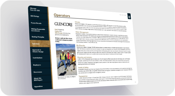 FNV: TSX | NYSE 21 Operators Asset: Antapaccay Country: Peru 2021 Revenue: $111.6 million glencore.com/sustainability We have a gold and silver stream on Glencore’s Antapaccay project in Peru. Climate: Glencore has targeted a 15% reduction in its total CO 2 e emissions by 2026, a 50% reduction in its total CO 2 e emissions by 2035, and has committed to be a net-zero total CO 2 e emissions company by 2050. As a significant producer and recycler of commodities (including copper, cobalt, nickel, zinc, silver and vanadium) that underpin the infrastructure and battery chemistry required to power electric vehicles and energy storage systems, Glencore believes that it is well positioned in the transition to a low-carbon economy. Water Management: Antapaccay is located in Peru’s Espinar province, an area of natural mineralisation. In Espinar, the water is mineralised and naturally unfit for human consumption. The increasing local population and expanding farming activities are creating stress on water availability. In addition, the limited infrastructure in the region is affecting the availability of water. Antapaccay has put in place measures, such as monitoring and water treatment, to ensure its activities do not affect water quality or availability. Antapaccay has also implemented a number of participatory monitoring programmes with local communities. All participatory and company monitoring activities demonstrate that Antapaccay operates in line with Peruvian law. Bio-Diversity: Glencore owns, leases or manages 105,000 hectares adjacent to protected areas and 188,000 hectares adjacent to high biodiversity areas. The Company’s operations are required to develop risk-based land stewardship and biodiversity action/management plans and to integrate these plans into core business planning processes. At Antapaccay, where locals lack the water infrastructure required to support agriculture and livestock activities, causing low agricultural productivity, the Company has initiated a project to install an irrigation system for managing water for agricultural purposes as well as constructing a reservoir to collect and distribute rainwater. Diversity and Inclusion: In 2021, 37.5% of Glencore’s board of directors and 13% of its executive officers were women and the Company had 13,875 female employees, representing 16% of its total workforce. In 2021, the Company adopted a Diversity and Inclusion Policy with the aim of inclusion of all people irrespective of race, gender, disability, medical or other need and giving equal access and opportunities and removing discrimination and intolerance. Health & Safety: During 2020, Glencore’s Lost Time Injury Frequency Rate (LTIFR) of 0.94 per million hours worked for all of its operations was lower than the previous year (2019: 0.99). During 2020, Glencore’s health working group implemented management plans in response to COVID-19 and undertook work to strengthen health management practices. Transparency: In 2021, Glencore published its “Climate Report 2021: Pathway to Net-zero”, which is aligned with the TCFD framework. The Company also publishes an annual Sustainability Report, which reports in line with Global Reporting Index (GRI) and Sustainability Accounting Standards Board (SASB) frameworks and for which the Company receives independent external assurance for certain reported energy, emission, water usage and other reported data. Franco-Nevada team during a due diligence visit to Antapaccay