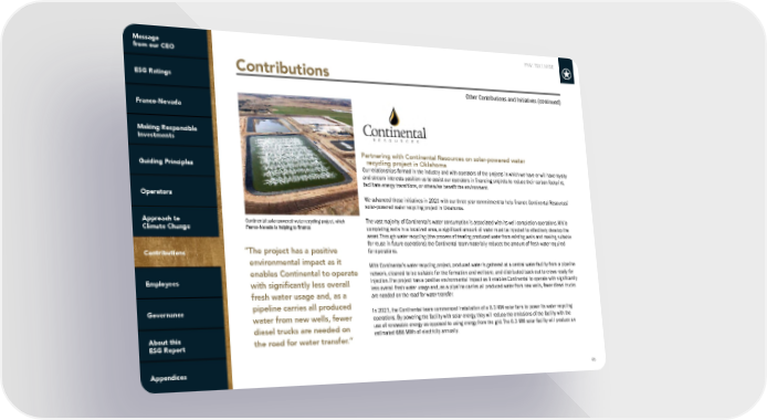 FNV: TSX | NYSE 46 Contributions Other Contributions and Initiatives (continued) Partnering with Continental Resources on solar-powered water recycling project in Oklahoma Our relationships formed in the industry and with operators of the projects in which we have or will have royalty and stream interests position us to assist our operators in financing projects to reduce their carbon footprint, facilitate energy transitions, or otherwise benefit the environment. We advanced these initiatives in 2021 with our three year commitment to help finance Continental Resources’ solar-powered water recycling project in Oklahoma. The vast majority of Continental’s water consumption is associated with its well completion operations. While completing wells in a localized area, a significant amount of water must be injected to effectively develop the asset. Through water recycling (the process of treating produced water from existing wells and making suitable for reuse in future operations) the Continental team materially reduces the amount of fresh water required for operations. With Continental’s water recycling project, produced water is gathered at a central water facility from a pipeline network, cleaned to be suitable for the formation and wellbore, and distributed back out to crews ready for injection. The project has a positive environmental impact as it enables Continental to operate with significantly less overall fresh water usage and, as a pipeline carries all produced water from new wells, fewer diesel trucks are needed on the road for water transfer. In 2021, the Continental team commenced installation of a 0.3 MW solar farm to power its water recycling operations. By powering the facility with solar energy, they will reduce the emissions of the facility with the use of renewable energy as opposed to using energy from the grid. The 0.3 MW solar facility will produce an estimated 686 MWh of electricity annually. Continental solar-powered water recycling project, which Franco-Nevada is helping to finance “The project has a positive environmental impact as it enables Continental to operate with significantly less overall fresh water usage and, as a pipeline carries all produced water from new wells, fewer diesel trucks are needed on the road for water transfer.”