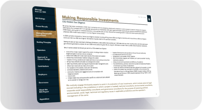 FNV: TSX | NYSE 10 Making Responsible Investments ESG-Related Due Diligence We believe that proper consideration of ESG risks in connection with the companies, projects and jurisdictions in which we seek to invest will enhance the long-term performance of our company and in turn generate real value for our shareholders. With each royalty and stream opportunity we conduct a comprehensive assessment of ESG factors, which guide our investment decisions. In the past few years, we have refrained from allocating capital to royalty and stream opportunities due to unfavorable ESG-related issues revealed in our due diligence review process. In 2020, we further enhanced our internal due diligence processes including refining internal ESG due diligence checklists, which helps direct our ESG due diligence review and inform our ESG due diligence informational requests made to the applicable operators. Starting this year, we have subscribed to McKinsey’s MineSpans, a data platform that provides over 1,000 data points per mine, including carbon and other greenhouse gas emissions generated by projects, for over 3,800 mines across the globe. We are using this information to better inform our ESG review of potential investments. We will typically assess the following as part of our ESG-related due diligence: • review of the climate-related impact of the project, including emission reduction targets and goals to achieve net-zero emissions • review of the safety and human rights records of the project and operator • review of any environmental incidents relating to the project • impacts of mining, operations and related activities on surrounding communities • tailings impoundments and waste rock storage at the project • water requirements, water sourcing and responsible water management plans • ethical track record and any history of corruption • the reputation of the operator, locally and internationally • workplace standards, protections and policies • community initiatives and engagement and prior consultation with indigenous peoples • closure plans • climate-related risks and opportunities specific to a project and plans adopted by the operator to manage such risks • impacts of development and operations on fauna, flora and biodiversity • air emissions and dust from the project • management by the operator of toxic materials • other environmental programs and initiatives put in place by operator including biodiversity protection • energy sources and requirements and efficiency of operations • the commitments by, and track record of, the operator to fundamental freedoms of individuals (e.g. freedom of association) • whether any external certifications have been obtained by the operator or project • whether the operator has committed to the RGMPs or the principles of the International Council on Mining & Metals (“ICMM”), Canadian Institute of Mining Metallurgy and Petroleum (“CIM”), Towards Sustainable Mining (“TSM”) or other relevant standards We routinely engage third-party experts to assist in its evaluation of new investments, which include external legal counsel (including in the jurisdictions in which a project is located), technical consultants, environmental consultants, corporate social responsibility consultants and governance consultants for the purpose of assessing political, environmental, social, legal, technical and regulatory issues in applicable jurisdictions and the operator’s management of the same.