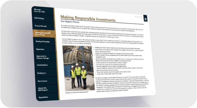 FNV: TSX | NYSE 9 Making Responsible Investments Due Diligence Process As a royalty and stream company, we do not operate mining or energy projects and do not exercise control over such operations. It follows that the most critical time for assessing and mitigating risks, including ESG risks, relating to an asset is at the outset prior to entering into the royalty and stream agreement. Our team uses a multi-disciplinary approach when evaluating potential transactions. Our team consists of professionals with experience and expertise in the fields of geology, mining, metallurgy, engineering, energy, finance and law. ESG issues relate to a number of these disciplines and our experience in evaluating and structuring royalty and stream transactions has given us significant exposure to and experience in addressing such issues. The due diligence process will vary in each case as necessary or appropriate in the circumstances, all applied on a risk-adjusted basis and varying based on the jurisdiction, type of mineral, and whether the project is an exploration, advanced or producing project, among other things. The due diligence generally conducted by our team includes, but is not limited to, the following: • identifying the risks to the environment and communities and the social impact of the project • analysis of the environmental, social and governance programs and policies put in place by operators and the effectiveness of same • analysis of the plans and prospects for the operator and project going forward • review of operator’s tailings management and the project’s water supply and the operator’s water management plans • determining whether the operators are committed to, and in compliance with, the World Gold Council Responsible Gold Mining Principles (“RGMPs”), to the extent applicable • country and political risk analysis where the project is located • site visits to the project with our consultants, as appropriate • extensive engagement with the operator’s management team • review of the general conditions of the jurisdiction in which the project is located, including local government and local community relations • review of the historical record of the operator and the specific project • review of the climate-related impact of the project During the due diligence process, Board members are very active in the review of potential investments including providing technical, political, financial, ESG and other expertise. Following the completion of due diligence, if management proposes to proceed with a transaction in excess of a threshold amount, it must first seek Board approval, whereupon the Board will conduct a comprehensive review of the due diligence done by the company, including an assessment of the risks with the potential investment that have been identified by management, including ESG-related risks. Below this threshold amount, management has discretion to proceed with an investment but must report the transaction to the Board in order to refresh its executive authority before being able to proceed with another investment. Antapaccay site visit by Franco-Nevada personnel