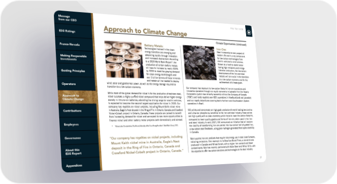 FNV: TSX | NYSE 37 Iron Ore: Steel is essential to every aspect of modern life and is a key component for low-carbon technologies from electric vehicles to wind turbines. Known as a hard-to-abate sector having high emissions and energy- intensive production, the low-carbon development of the iron and steel industry will be crucial in the transition to a low-carbon economy and for the achievement of climate goals. Our company has exposure to low-carbon footprint iron ore operations and innovative operators through our equity ownership in Labrador Iron Ore Royalty Corporation (which has minority ownership of Iron Ore Company of Canada (“IOC”) and holds royalties over IOC’s operations in Newfoundland and Labrador) and our royalty debentures covering Vale’s Northern and Southeastern System operations in Brazil. IOC pellets and concentrate are high grade products with world leading low alumina and ultra-low phosphorus, beneficial to the iron and steel industry. These pellets are high quality with a clean chemistry, which helps to lower the carbon footprint, compared to lower quality grades and forms of iron ore, when used in the iron and steel industry. In early 2021, IOC announced an initiative that will explore the viability of transforming iron ore pellets into low-carbon hot briquetted iron, a low-carbon steel feedstock, using green hydrogen generated from hydro electricity in Canada. Vale supplies iron ore products that require less energy use in steel blast furnaces, reducing emissions. One example is its Brazilian Blend Fines, a blend of ores produced in Carajás and Minas Gerais, with a higher iron content and fewer contaminants. Vale has recently partnered with Kobe Steel and Mitsui & Co. with the objective to offer low-carbon solutions and technologies to the steel industry. Battery Metals: Technologies involved in the clean energy transition are emerging and advancing rapidly through innovation and increased deployment. According to a 2020 World Bank Report*, the production of certain battery metals will have to increase by nearly 500% by 2050 to meet the growing demand for clean energy technologies and over 3 billion tonnes of these minerals and metals will be needed to deploy wind, solar and geothermal power, as well as the energy storage required to transition to a low-carbon economy. While most of the global demand for nickel is for the production of stainless steel, nickel sulphate, a highly purified nickel compound that helps deliver higher energy density in lithium-ion batteries, extending the driving range for electric vehicles, is expected to become the second largest application for nickel in 2030. Our company has royalties on nickel projects, including Mount Keith nickel mine in Australia, Eagle’s Nest deposit in the Ring of Fire in Ontario, Canada and Crawford Nickel-Cobalt project in Ontario, Canada. These projects are poised to benefit from increasing demand for nickel and we expect to see more opportunities to finance nickel and other battery metal projects both domestically and abroad. Approach to Climate Change Climate Opportunities (continued) * “Minerals for Climate Action: The Mineral Intensity of the Clean Energy Transition”, World Bank Group, 2020. “Our company has royalties on nickel projects, including Mount Keith nickel mine in Australia, Eagle’s Nest deposit in the Ring of Fire in Ontario, Canada and Crawford Nickel-Cobalt project in Ontario, Canada.”