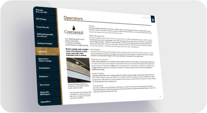 FNV: TSX | NYSE 28 Operators Asset: Royalty Acquisition Venture Country: United States clr.com/about-continental/ environmental-social-and-governance-esg We have a strategic royalty acquisition venture with Continental to jointly acquire royalty rights within Continental’s areas of operation. Certain of the standards on page 18 above have not been implemented by, and are not applicable to, Continental Resources, which is an energy producer with operations solely located in the United States. Climate: Continental has accomplished over 55% reduction in methane intensity and approximately 40% reduction in greenhouse gas intensity from 2016 to 2020. In early 2022, Continental announced a strategic investment of $250 million into Summit Carbon Solutions’ project to capture and sequester 8-12 million metric tonnes of CO 2 per year. Water Management: Continental decreased its water intensity by 27.6% year-over-year from 0.47 in 2019 to 0.34 (BBL/BOE produced) in 2020. Since 2017, the Company’s water intensity has decreased by nearly 50%. Recycling of water continues to be a particular focus in the Company’s Southern Region operations. In 2020, 70% of wells completed in Oklahoma utilized recycled water for stimulation operations, and recycled water accounted for 25% of total water usage in its Southern operations. Since 2016, Continental recycled approximately 35 million barrels of water in its Oklahoma operations using its state-of-the-art water recycling facilities. Bio-Diversity: Under Continental’s environmental policy, protection of wildlife and protected species is a fundamental aspect of its operations. In addition to day-to-day avoidance, minimization, and mitigation practices, Continental has participated in a number of conservation planning and work groups, including those for the lesser prairie chicken, the American burying beetle, and the Dakota skipper. Diversity and Inclusion: In 2020, women represented 14% of Continental’s board of directors and 26% of its total workforce. Continental recently formalized and built upon its diversity and inclusion programs and has chartered a Diversity and Inclusion Committee comprised of employees across all corporate functions. The Company has engaged external training resources for its entire workforce, including interview training for hiring managers focused on ensuring a fair and systematic approach for recruiting and selecting individuals from diverse backgrounds for competitive job openings. Health & Safety: Continental achieved record health and safety performance in 2020. The Company recorded a total recordable incident rate (TRIR) of 0.40 in 2020, a reduction year-over-year (2019: 0.47). In response to the COVID-19 pandemic, Continental has offered free in-office testing and held in-office vaccination clinics for employees and family members, provided flexible work schedules for impacted employees, and utilized dedicated contact tracing personnel. Transparency: Continental publishes an annual ESG Report. The ESG Report is informed by the International Petroleum Industry Environmental Conservation Association (IPIECA), Global Reporting Initiative (GRI), Sustainability Standards Board (SASB) framework, as well as the United Nations Sustainable Development Goals. Continental’s Founder and Chairman has donated more than $65 million for diabetes research and patient support