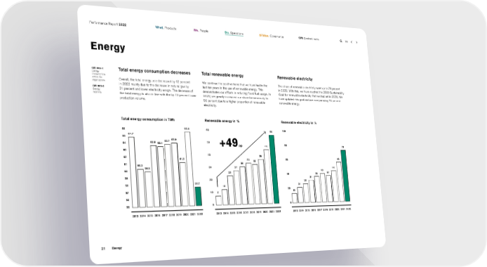 Performance Report 2022 What. Products We. People Do. Operations & Value. Governance GRI Content Index Energy GRI 302-1: Total energy consumption decreases Total renewable energy Renewable electricity Energy consumption within the Overall, the total energy use decreased by 12 percent We continue the positive trend that we have had in the The share of renewable electricity went up to 73 percent organization in 2022 mainly due to the decrease in natural gas by last ten years in the use of renewable energy. This in 2022. With this, we have reached the 2030 Sustainability GRI 302-3: 21 percent and lower electricity usage. The decrease of demonstrates our efforts in reducing fossil fuel usage. In Goal for renewable electricity that we had set in 2020. We Energy intensity the total energy is also in line with the by 13 percent lower 2022, we greatly increased our share tremendously to have updated this goal and are now pursuing 70 percent production volume. 56 percent due to a higher proportion of renewable renewable energy. electricity. Total energy consumption in TWh Renewable energy in % Renewable electricity in % 66 65.6 60 56 100 65 64.7 63.7 63.9 64 63.6 63.4 50 +49 pp 44 80 73 63 62 40 36 61.2 33 32 60 56 61 60.3 30 59.9 30 27 44 60 23 40 40 36 37 59 20 31 57.7 26 58 12 21 57 20 13 10 7 56 55 0 0 2013 2014 2015 2016 2017 2018 2019 2020 2021 2022 2013 2014 2015 2016 2017 2018 2019 2020 2021 2022 2013 2014 2015 2016 2017 2018 2019 2020 2021 2022 21 Energy
