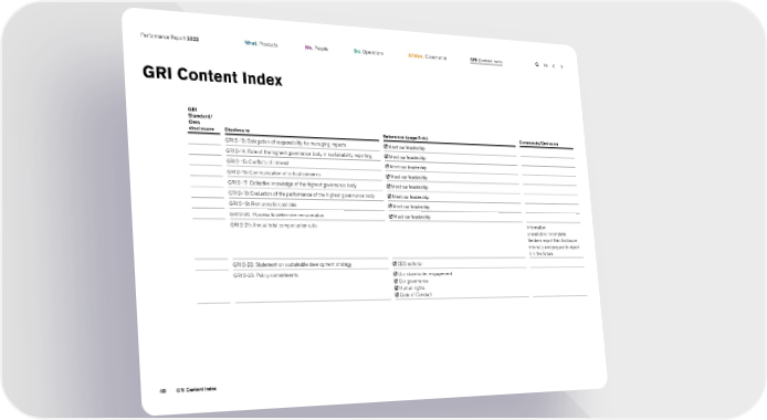 Performance Report 2022 What. Products We. People Do. Operations & Value. Governance GRI Content Index GRI Content Index GRI Standard/ Own disclosure Disclosure Reference (page/link) Comments/Omission GRI 2-13: Delegation of responsibility for managing impacts Meet our leadership GRI 2-14: Role of the highest governance body in sustainability reporting Meet our leadership GRI 2-15: Conflicts of interest Meet our leadership GRI 2-16: Communication of critical concerns Meet our leadership GRI 2-17: Collective knowledge of the highest governance body Meet our leadership GRI 2-18: Evaluation of the performance of the highest governance body Meet our leadership GRI 2-19: Remuneration policies Meet our leadership GRI 2-20: Process to determine remuneration Meet our leadership GRI 2-21: Annual total compensation ratio Information unavailable/ incomplete. Beckers report this disclosure internally and prepare to report it in the future. GRI 2-22: Statement on sustainable development strategy CEO editorial GRI 2-23: Policy commitments Our stakeholder engagement Our governance Human rights Code of Conduct 40 GRI Content Index