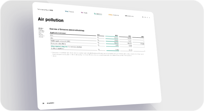 Performance Report 2022 What. Products We. People Do. Operations & Value. Governance GRI Content Index Air pollution GRI 305-7: Overview of Emissions data & methodology Nitrogen oxides (NOx), sulfur oxides Significant air emissions¹ Unit 2022 2021 2020 (SOx), and other NOx kg 38,619 44,934 – signi昀椀cant air emissions SOx kg 37,586 41,257 – Volatile organic compounds (VOC) kg 432,270 469,270 470,800 Particulate matter (PM10) kg 4,454 5,088 – Other standard categories of air emissions identified 2 in relevant regulations kg 11,085 14,778 – ¹ The source for the emission factors for air emissions is ecoinvent and the Swedish Environmental Protection Agency. We calculate air emissions from all operations and per relevant activity in Scope 1 and 2. The data is based on activity data from the climate reporting. For vehicles, PM emission factors are reported aggregated and are labeled PM (unspecified) in these calculations. 2 PM 2.5 28 Air pollution
