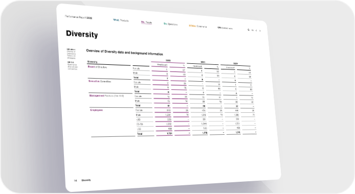 Performance Report 2022 What. Products We. People Do. Operations & Value. Governance GRI Content Index Diversity GRI 405-1: Overview of Diversity data and background information Diversity of governance bodies and 2022 2021 2020 employees GRI 2-9: Diversity Headcount % Headcount % Headcount % Governance Board of Directors Female 4 57 4 50 4 44 structure and composition Male 3 43 4 50 5 56 Total 7 – 8 – 9 – Executive Committee Female 2 25 1 14 1 17 Male 6 75 6 86 5 83 Total 8 – 7 – 6 – Management Positions (Tier 0-2) Female 16 26 10 21 7 19 Male 45 74 38 79 30 81 Total 61 – 48 – 37 – Employees Female 440 26 456 26 446 26 Male 1,284 74 1,319 74 1,295 74 50 499 – 500 – 469 – Total 1,724 – 1,775 – 1,741 – 14 Diversity