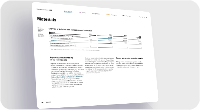 Performance Report 2022 What. Products We. People Do. Operations & Value. Governance GRI Content Index Materials GRI 301-1: Overview of Materials data and background information Materials used by weight or volume Materials Unit 2022 2021 2020 GRI 301-2: 1 Recycled input Total weight of production and packaging materials tons 140,016 164,650 141,625 materials used Of which non-renewable materials used tons 139,223 163,623 140,612 Of which renewable materials used tons 793 1,027 1,106 Recycled input materials used to manufacture the organization’s primary products and services % 0 0 – 1 This figure is based on the purchased volume of raw materials and does not include packaging materials. Improving the sustainability Basing our assessments on the BSI, we promote the use of Reused and recycled packaging material of our raw materials renewable raw materials, avoid using any minerals that are scarce or endangered, and sell coatings that provide proven Although we exclude recycled packing material from the Regarding our raw materials, we are working with key functional sustainability benefits for customers and society calculation for the GRI 301-2 indicator, we have numerous partners upstream to build strong and effective collaboration. while in service. We are looking at using bio-sourced raw initiatives in this regard such as the reuse of steel drums or Following our net-sustainable R&D strategy, our upstream materials and recycled plastic content in Beckers’ product plastic IBCs so they can be filled again and again. collaboration focuses on getting access to more sustainable formulations. The BSI provides a data-driven, objective raw materials. To achieve this, we use the Beckers means to measure and track the development of our Sustainability Index (BSI) – our tool that describes our sustainable product portfolio. products’ sustainability from two complimentary dimensions, Material Sustainability and Functional Sustainability. These reflect our view that coatings’ sustainability is always a combination of both the sustainable nature of the materials and processes we use to make our coatings and how our coatings are then used to add sustainable value to the article that is being coated. 09 Materials