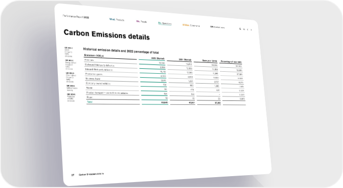 Performance Report 2022 What. Products We. People Do. Operations & Value. Governance GRI Content Index Carbon Emissions details GRI 305-1: Historical emission details and 2022 percentage of total Direct (Scope 1) GHG Emissions (tCO e) 2022 (Market) 2021 (Market) Base year (2013) Percentage of total 2022 emissions 2 GRI 305-2: Premises 14,144 16,493 20,036 29.08% Energy indirect Outbound third-party deliveries 9,068 12,399 14,368 18.64% (Scope 2) GHG Inbound third-party deliveries 18,118 12,060 11,585 37.25% emissions GRI 305-3: Production gases 4,323 4,693 6,833 8.89% Other indirect (Scope 3) Business travel 2,047 1,031 2,737 4.21% GHG emissions Company-owned vehicles 701 892 1,382 1.44% GRI 305-4: Waste 95 178 432 0.20% GHG emission intensity Product transport – owned & leased vehicles 126 163 – 0.26% GRI 305-5: Reduction Paper 18 12 22 0.04% of GHG emissions Total 48,640 47,921 57,393 27 Carbon Emissions details