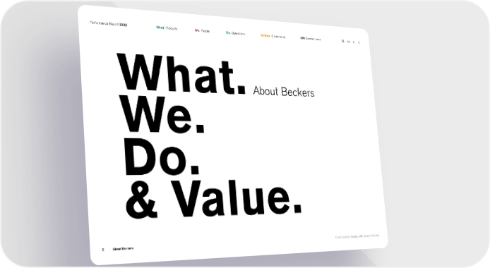 Performance Report 2022 What. Products We. People Do. Operations & Value. Governance GRI Content Index About Beckers About Beckers What. We. Do. & Value. 2 About Beckers Optimized for display with Adobe Acrobat