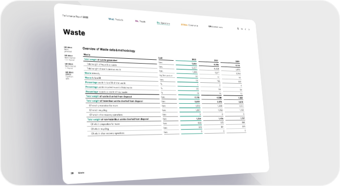 Performance Report 2022 What. Products We. People Do. Operations & Value. Governance GRI Content Index Waste GRI 306-3: Overview of Waste data & methodology Waste generated Waste Unit 2022 2021 2020 GRI 306-4: Waste diverted Total weight of waste generated tons 7,482 8,375 8,114 from disposal GRI 306-5: Total weight of hazardous waste tons 5,527 6,358 5,870 Waste directed Total weight of non-hazardous waste tons 1,955 2,017 2,244 to disposal GRI 306-3 Waste intensity kg/ ton product 52 51 52 (2016): Signi昀椀cant Waste to landfill tons 73 185 301 spills Percentage waste to landfill of total waste % 1 2 4 Percentage waste recycled/reused of total waste % 55 54 54 Percentage hazardous waste of total waste % 74 76 72 Total weight of waste diverted from disposal tons 4,146 4,526 4,353 Total weight of hazardous waste diverted from disposal tons 2,620 3,070 2,616 Of which preparation for reuse tons 1,553 1,808 1,213 Of which recycling tons 1,067 1,262 1,404 Of which other recovery operations tons 0 0 0 Total weight of non-hazardous waste diverted from disposal tons 1,526 1,456 1,737 Of which preparation for reuse tons 608 555 896 Of which recycling tons 918 901 841 Of which other recovery operations tons 0 0 0 29 Waste
