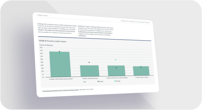 Intelligent Investment Strengthening Value Through ESG | Survey of Global Property Professionals Buildings with convenient access to public transportation systems Buildings that support cycling and walking and those with inclusive led the list. Nearly 40% of respondents would seek a discount or design that meet the needs of all employees also made the top five walk away from a deal altogether if a building is not near public list. Nearly half of respondents are willing to pay a premium for transport. This is likely due to less tolerance for long commute building features that improve the physical and mental health of times, especially from suburban to downtown locations.3 employees and for buildings that have health and well-being certifications. FIGURE 16: Proximity to public transport Percent of Responses 50% 45% 40% 35% 30% 25% 20% 15% 10% 5% 0% If present, we’d consider paying a premium If absent, we’d seek a discount If absent, we’d exit from or reject the building It wouldn’t impact our decision All Investor Occupier 3 “Cross-Generational Attitudes That Will Transform the Built Environment,” CBRE Research, Nov. 28, 2022.