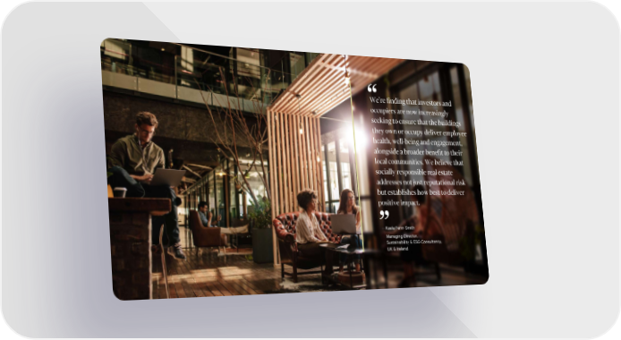 Intelligent Investment Strengthening Value Through ESG | Survey of Global Property Professionals We’re finding that investors and “ occupiers are now increasingly seeking to ensure that the buildings they own or occupy deliver employee health, well-being and engagement, alongside a broader benefit to their local communities. We believe that socially responsible real estate addresses not just reputational risk but establishes how best to deliver positive impact. . —Kaela Fenn-Smith Managing Director, ” Sustainability & ESG Consultancy, UK & Ireland