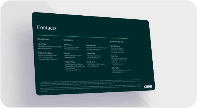 Contacts Report Contact: Contributors: Research Leadership: Julie Whelan Miles Gibson Vincent Planque Richard Barkham Global Head of Occupier Thought Leadership Executive Director, UK Research Senior ESG Analyst, Econometric Advisors Global Chief Economist & julie.whelan@cbre.com miles.gibson @cbre.com vincent.planque@cbre.com Head of Americas Research richard.barkham@cbre.com Stephanie Marthakis Felix Lee Toby Radcliffe Research Engagement Director Research Manager, Asia Pacific Senior Analyst, UK Research Henry Chin & ESG Task Force Lead felix.lee@cbre.com toby.radcliffe@cbre.com Global Head of Investor Thought stephanie.marthakis @cbre.com Leadership & Head of Research, DraganaMarina Ben Wurtzel Asia Pacific Head of Research & Data Intelligence,, Senior Analyst, Tri-State Research henry.chin@cbre.com.hk Denmark & Sustainability Research Lead, ben.wurtzel@cbre.com Continental Europe Julie Whelan dragana.marina @cbre.com Global Head of Occupier Thought Leadership julie.whelan@cbre.com ©Copyright 2023. All rights reserved. This report has been prepared in good faith, based on CBRE’s current anecdotal and evidence based views of the commercial real estate market. Although CBRE believes its views reflect market conditions on the date of this presentation, they are subject to significant uncertainties and contingencies, many of which are beyond CBRE’s control. In addition, many of CBRE’s views are opinion and/or projections based on CBRE’s subjective analyses of current market circumstances. Other firms may have different opinions, projections and analyses, and actual market conditions in the future may cause CBRE’s current views to later be incorrect. CBRE has no obligation to update its views herein if its opinions, projections, analyses or market circumstances later change. Nothing in this report should be construed as an indicator of the future performance of CBRE’s securities or of the performance of any other company’s securities. You should not purchase or sell securities—of CBRE or any other company—based on the views herein. CBRE disclaims all liability for securities purchased or sold based on information herein, and by viewing this report, you waive all claims against CBRE as well as against CBRE’s affiliates, officers, directors, employees, agents, advisers and representatives arising out of the accuracy, completeness, adequacy or your use of the information herein.