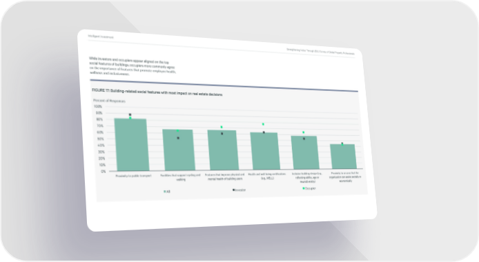 Intelligent Investment Strengthening Value Through ESG | Survey of Global Property Professionals While investors and occupiers appear aligned on the top social features of buildings, occupiers more commonly agree on the importance of features that promote employee health, wellness and inclusiveness. FIGURE 17: Building-related social features with most impact on real estate decisions Percent of Responses 100% 90% 80% 70% 60% 50% 40% 30% 20% 10% 0% Proximity to public transport Facilities that support cycling and Features that improve physical and Health and well-being certifications Inclusive building design (e.g., Proximity to an area that the walking mental health of building users (e.g., WELL) reflecting ability, age or organization can assist socially or neurodiversity) economically All Investor Occupier