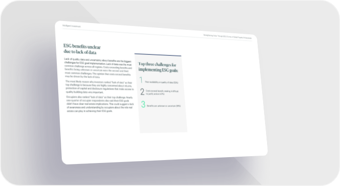 Intelligent Investment Strengthening Value Through ESG | Survey of Global Property Professionals ESG benefits unclear due to lack of data Lack of quality data and uncertainty about benefits are the biggest Top three challenges for challenges for ESG goal implementation. Lack of data was the most common challenge across all regions. Costs exceeding benefits and implementing ESG goals: benefits being unknown or uncertain were the second and third most common challenges. The opinion that costs exceed benefits may be driven by the lack of data. The most likely reason why investors ranked ”lack of data” as their 1 Poor availability or quality of data (53%) top challenge is because they are highly concerned about returns, protection of capital and disclosure regulations that make access to Costs exceed benefit, making it difficult quality building data very important. 2to justify action (47%) Occupiers also ranked ”lack of data” as their top challenge. Nearly one-quarter of occupier respondents also said their ESG goals didn’t have clear real estate implications. This could suggest a lack 3Benefits are unknown or uncertain (36%) of awareness and understanding by occupiers about the role real estate can play in achieving their ESG goals.