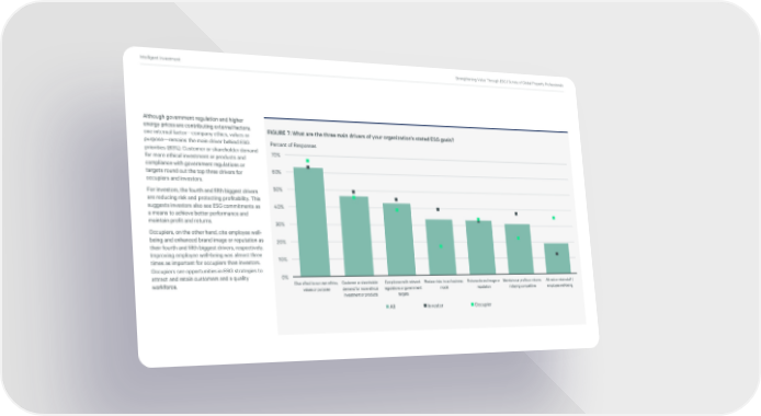 Intelligent Investment Strengthening Value Through ESG | Survey of Global Property Professionals Although government regulation and higher energy prices are contributing external factors, FIGURE 7: What are the three main drivers of your organization’s stated ESG goals? one internal factor—company ethics, values or purpose—remains the main driver behind ESG Percent of Responses priorities (63%). Customer or shareholder demand 70% for more ethical investment or products and compliance with government regulations or targets round out the top three drivers for 60% occupiers and investors. For investors, the fourth and fifth biggest drivers 50% are reducing risk and protecting profitability. This suggests investors also see ESG commitments as 40% a means to achieve better performance and maintain profit and returns. 30% x Occupiers, on the other hand, cite employee well- being and enhanced brand image or reputation as 20% their fourth and fifth biggest drivers, respectively. Improving employee well-being was almost three 10% times as important for occupiers than investors. Occupiers see opportunities in ESG strategies to attract and retain customers and a quality 0% workforce. Give effect to our own ethics, Customer or shareholder Compliance with relevant Reduce risks in our business Enhance brand image or Maintain our profits or returns Attract or retain staff / values or purpose demand for more ethical regulations or government model reputation / staying competitive employee well-being investment or products targets All Investor Occupier