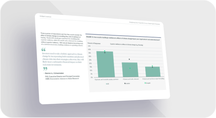 Intelligent Investment Strengthening Value Through ESG | Survey of Global Property Professionals Three-quarters of respondents said that they would consider the FIGURE 13: How would a building’s resilience to effects of climate change impact your organization’s real estate decisions? effect of climate change on a building they were investing in or leasing. Nearly 40% would pay a premium for a building with superior resiliency, while 22% would seek a discount for a building without superior resiliency. With natural disasters becoming more Percent of Responses Superior resilience to effects of climate change (e.g., flooding) of a common occurrence, building resiliency is a growing concern. 45% 40% Investors need to take a holistic approach to climate 35% change by incorporating both transition and physical 30% “ climate risks into their strategies; otherwise, they will 25% likely incur a substantive financial impact on their 20% real estate investments. 15% 10% —Dennis A.J. Schoenmaker 5% PhD, Executive Director and Principal Economist, ” 0% CBRE, Econometric Advisors & Global Research If present, we’d consider paying a premium If absent, we’d seek a discount If absent, we’d exit from or reject the building All Investor Occupier
