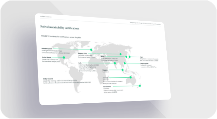 Intelligent Investment Strengthening Value Through ESG | Survey of Global Property Professionals Role of sustainability certifications FIGURE 11: Sustainability certifications across the globe United Kingdom Building Research Establishment Environmental Assessment Method (BREEAM) Mainland China Leadership in Energy and Korea Japan United States Environmental Design (LEED) Green Standard for Energy and Comprehensive Assessment System for Leadership in Energy and Environmental Design (G-SEED) Built Environment Efficiency (CASBEE) Environmental Design (LEED) India Hong Kong SAR Indian Green Building Council (IGBC) Building Environmental Green Building Rating Systems Assessment Method (BEAM Plus) Leadership in Energy and Singapore Environmental Design (LEED) Green Mark Global General Australia Leadership in Energy and Environmental Design (LEED) Green Star Building Research Establishment Environmental Assessment Method (BREEAM) National Australian Built Environment Rating System (NABERS) New Zealand Green Star National Australian Built Environment Rating System (NABERS)