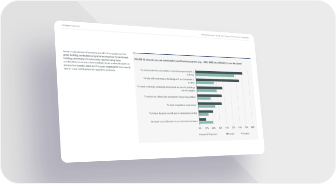 Intelligent Investment Strengthening Value Through ESG | Survey of Global Property Professionals Seventy-one percent of investors and 58% of occupiers say that green building certification programs are important to benchmark FIGURE 12: How do you use sustainability certification programs (e.g., LEED, BREEAM, NABERS) in your decisions? building performance. Investors also reported using these certifications to enhance their building’s brand and marketability to prospective tenants. Asian and European respondents more heavily rely on these certifications for regulatory purposes. To understand the sustainability credentials or potential of a building To help with marketing or branding with our customers or tenants To meet a voluntary screening requirement we have for buildings we will consider To ensure we collect data consistently across the portfolio To meet a regulatory requirement To inform the price we will pay in a transaction or deal We don't use certification in our real estate decisions 0% 10% 20% 30% 40% 50% 60% 70% 80% Percent of Responses Investor Occupier