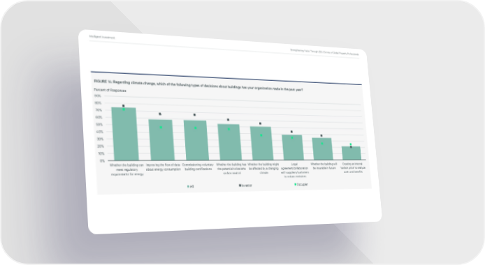 Intelligent Investment Strengthening Value Through ESG | Survey of Global Property Professionals FIGURE 14: Regarding climate change, which of the following types of decisions about buildings has your organization made in the past year? Percent of Responses 90% 80% 70% 60% 50% 40% 30% 20% 10% 0% Whether the building can Improving the flow of data Commissioning voluntary Whether the building has Whether the building might Legal Whether the building will Creating an internal meet regulatory about energy consumption building certifications the potential to become be affected by a changing agreement/collaboration be insurable in future "carbon price" to analyze requirements for energy carbon neutral climate with suppliers/customers costs and benefits to reduce emissions All Investor Occupier
