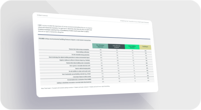 Intelligent Investment Strengthening Value Through ESG | Survey of Global Property Professionals CBRE’s survey revealed the importance of certain environmental building features on property values and transaction decisions. Our goal was to determine what features that occupiers and investors would pay a premium for, or the absence of which would cause them to seek a discount or reject a transaction altogether. FIGURE 8: How environmental building features impact a real estate transaction Pay a Premium Seek a Discount Reject Building Total Impact (if present) (if absent) (if absent) Features that reduce energy consumption 35% 31% 18% 84% Green building certification 45% 21% 13% 79% On-site renewable energy generation 58% 15% 4% 77% Smart technology that adjusts building operations to reduce environmental impact 53% 18% 5% 76% Superior resilience to effects of climate change (e.g., flooding) 37% 22% 16% 75% Features that reduce building water consumption 41% 20% 7% 68% Uses a green or renewable electricity tariff 38% 16% 9% 63% Electric vehicle charging points 38% 17% 7% 62% On-site facilities to reduce and recycle waste 36% 20% 6% 62% Use of sustainably sourced building materials (e.g., timber) 44% 13% 4% 61% Green lease clauses to enforce action 33% 17% 8% 58% On-site biodiversity or protection of local wildlife 32% 13% 3% 48% Building is refurbished, renovated or converted rather than brand new 30% 12% 5% 47% Note: Total Impact = If present, we’d consider paying a premium + If absent, we’d seek a discount + If absent, we’d exit from or reject the building.