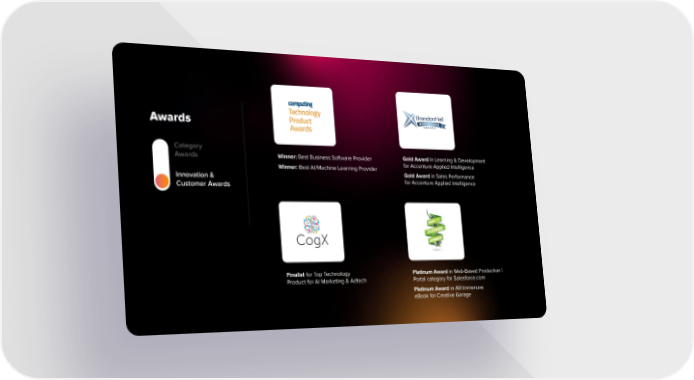 RELAYTO AI powered platform has brought an entirely new approach to pursuits, by Awards converting all sales content and any file type into a single immersive digital experience, which enables deal teams to connect and collaborate with customers, bring big ideas to Category life and differentiate Accenture from competition. Gold Award in Learning & Development Winner: Best Business Software Provider Awards for Accenture Applied Intelligence Winner: Best AI/Machine Learning Provider Gold Award in Sales Performance Innovation & for Accenture Applied Intelligence Customer Awards Finalist for Top Technology Platinum Award in Web-Based Production | Product for AI Marketing & Adtech Portal category for Salesforce.com Platinum Award in AR/immersive eBook for Creative Garage