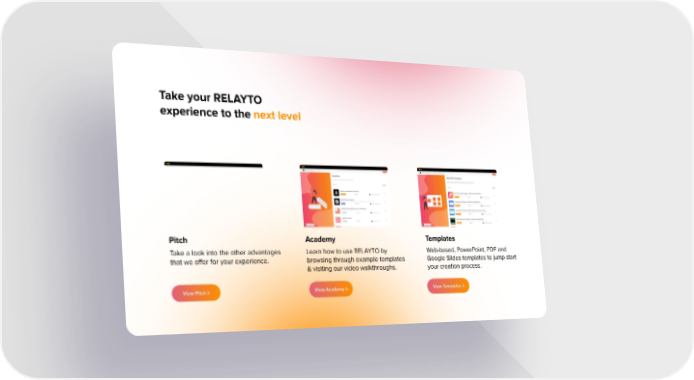 Take your RELAYTO experience to the next level Pitch Academy Templates Take a look into the other advantages Learn how to use RELAYTO by Web-based, PowerPoint, PDF and that we offer for your experience. browsing through example templates Google Slides templates to jump-start & visiting our video walkthroughs. your creation process. View Pitch View Academy View Templates