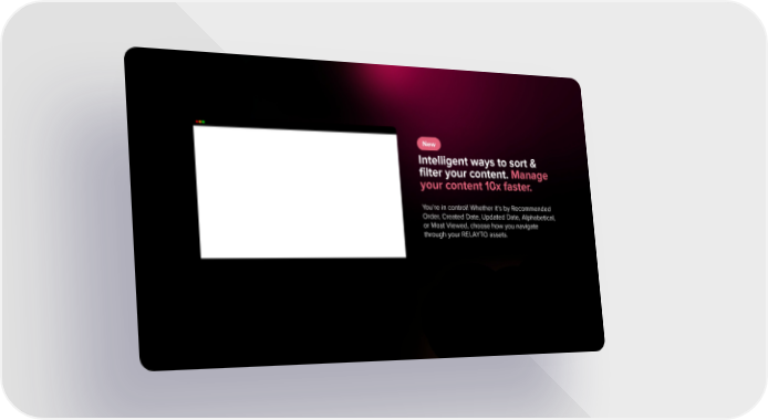 New Intelligent ways to sort & filter your content. Manage your content 10x faster. You’re in control! Whether it’s by Recommended Order, Created Date, Updated Date, Alphabetical, or Most Viewed, choose how you navigate through your RELAYTO assets.