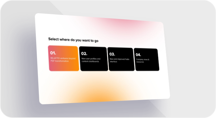 Select where do you want to go 01. 02. 03. 04. RELAYTO ventures beyond New user proļ¬les and New and improved hubs Company news & PDF transformation content dashboards interface resources