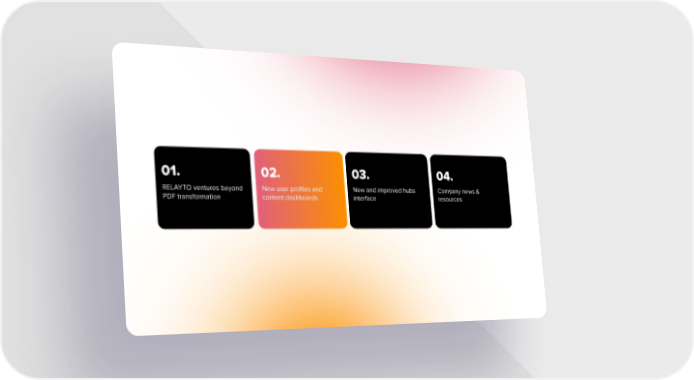 01. 02. 03. 04. RELAYTO ventures beyond New user proļ¬les and New and improved hubs Company news & PDF transformation content dashboards interface resources