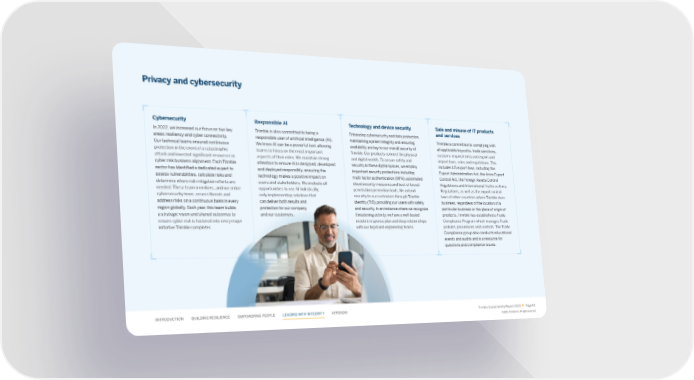 Privacy and cybersecurity Cybersecurity Responsible AI Technology and device security Sale and misuse of IT products In 2022, we increased our focus on two key Trimble is also committed to being a Enhancing cybersecurity and data protection, and services areas: resiliency and cyber connectivity. responsible user of arti昀椀cial intelligence (AI). maintaining system integrity and ensuring Trimble is committed to complying with Our technical teams ensured continuous We know AI can be a powerful tool, allowing availability are key to our overall security at all applicable boycotts, trade sanctions, protection in the event of a catastrophic teams to focus on the most important Trimble. Our products connect the physical customs requirements and export and attack and invested signi昀椀cant resources in aspects of their roles. We maintain strong and digital worlds. To assure safety and import laws, rules and regulations. This cyber risk business alignment. Each Trimble attention to ensure AI is designed, developed security in these digital spaces, we employ includes US export laws, including the sector has identi昀椀ed a dedicated expert to and deployed responsibly, ensuring the important security protections including Export Administration Act, the Arms Export assess vulnerabilities, calculate risks and technology makes a positive impact on multi-factor authentication (MFA), automated Control Act, the Foreign Assets Control determine where risk mitigation e昀昀orts are users and stakeholders. We evaluate all cloud security measures and best-of-breed Regulations and International Tra昀케c in Arms needed. These team members, and our entire opportunities to use AI holistically, penetration prevention tools. We extend Regulations, as well as the export control cybersecurity team, assess threats and only implementing solutions that security to our customers through Trimble laws of other countries where Trimble does address risks on a continuous basis in every can deliver both results and Identity (TID), providing our users with safety business, regardless of the location of a region globally. Each year, this team builds protection for our company and security. In an instance where we recognize particular business or the place of origin of a strategic vision and shared outcomes to and our customers. threatening activity, we have a well-tested products. Trimble has established a Trade ensure cyber-risk is factored into every major incident response plan and deep relationships Compliance Program which manages Trade initiative Trimble completes. with our legal and engineering teams. policies, procedures and controls. The Trade Compliance group also conducts educational events and audits and is a resource for questions and compliance issues. INTRODUCTION BUILDING RESILIENCE EMPOWERING PEOPLE LEADING WITH INTEGRITY APPENDIX Trimble Sustainability Report 2022 Page 45 ©2023, Trimble Inc. All rights reserved.