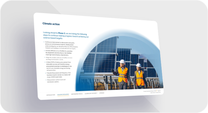 Climate action Looking ahead to Phase 3, we are taking the following steps to continue making progress toward achieving our science-based targets: • Continuous improvement to data access and quality across our environmental footprint, thereby better understanding how our decisions a昀昀ect our GHG emissions footprint and enabling us to track and meet our targets. • Increase e昀케ciency in our facilities by upgrading key equipment and ensuring our new facilities meet high-level e昀케ciency requirements. • Adapt the number and size of facilities to meet our long-term business needs. • Achieve 100% of energy procurement from renewable sources and transition energy procurement practices to emphasize on-site and o昀昀-site renewable energy purchasing and generation. • Evaluate the purpose and frequency of all business travel to remain at or below half of pre-COVID travel totals. • Choose lower-carbon travel and distribution options. INTRODUCTION BUILDING RESILIENCE EMPOWERING PEOPLE LEADING WITH INTEGRITY APPENDIX Trimble Sustainability Report 2022 Page 14 ©2023, Trimble Inc. All rights reserved.