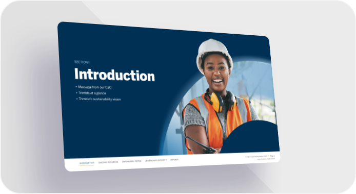 SECTION I: Introduction Message from our CEO Trimble at a glance Trimble’s sustainability vision INTRODUCTION BUILDING RESILIENCE EMPOWERING PEOPLE LEADING WITH INTEGRITY APPENDIX Trimble Sustainability Report 2022 Page 3 ©2023, Trimble Inc. All rights reserved.