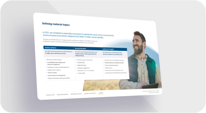 De昀椀ning material topics In 2021, we completed a materiality assessment to identify the issues across environmental, social and governance (ESG) categories that re昀氀ect Trimble’s impact globally. The topics we identi昀椀ed drive our strategic priorities and decision-making across Trimble, from the way we allocate resources to the time and energy our team spends on initiatives across our business. Building resilience Empowering people Leading with integrity Our interconnected solutions enable industries Our diverse community of innovators and Our dedication to leadership principles to adapt, grow and thrive over time. problem solvers create opportunities for ensures excellence in everything we do. others to thrive. • Business model resilience • Diversity, equity and inclusion • Corporate and sustainability governance • Sustainable product design and • Future of work • Business ethics/fair business practices lifecycle management • Talent attraction • Privacy and data protection • Innovation, research and development • Employee engagement • Cybersecurity • Supply chain resilience • Equitable access to technology • Responsible arti昀椀cial intelligence (AI) • Climate change • Human rights • Sale and misuse of IT products and services • Natural resource management • Waste and circular economy transition INTRODUCTION BUILDING RESILIENCE EMPOWERING PEOPLE LEADING WITH INTEGRITY APPENDIX Trimble Sustainability Report 2022 Page 48 ©2023, Trimble Inc. All rights reserved.