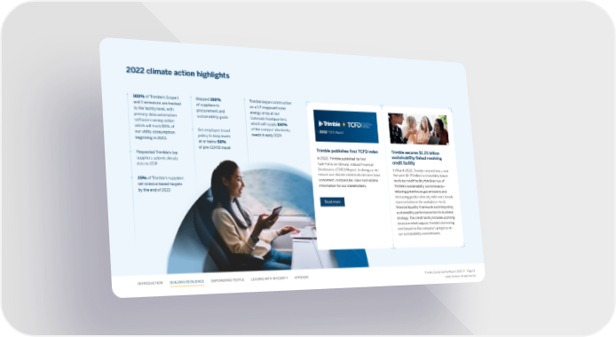 2022 climate action highlights 100% of Trimble’s Scope 1 Mapped 100% Trimble began construction and 2 emissions are tracked of suppliers to on a 1.7-megawatt solar to the facility level, with procurement and energy array at our primary data automation sustainability goals Colorado headquarters, software coming online which will supply 100% which will track 80% of Set employee travel of the campus’ electricity 2022 TCFD Report our utility consumption policy to keep levels needs in early 2024 beginning in 2023. at or below 50% of pre-COVID travel Trimble publishes 昀椀rst TCFD index Trimble secures $1.25 billion Requested Trimble’s top In 2022, Trimble published its 昀椀rst sustainability-linked revolving suppliers submit climate Task Force on Climate-related Financial credit facility data to CDP Disclosures (TCFD) Report. In doing so, we In March 2022, Trimble entered into a new ensure our climate-related disclosures have 昀椀ve-year $1.25 billion sustainability-linked 25% of Trimble’s suppliers consistent, comparable, clear and reliable revolving credit facility that links two of set science-based targets information for our stakeholders. Trimble’s sustainability commitments— by the end of 2022 reducing greenhouse gas emissions and increasing gender diversity with more female Read more representation in the workplace—to its 昀椀nancial liquidity framework and integrating sustainability performance into its business strategy. The credit facility includes a pricing structure which adjusts Trimble’s borrowing cost based on the company’s progress on our sustainability commitments. INTRODUCTION BUILDING RESILIENCE EMPOWERING PEOPLE LEADING WITH INTEGRITY APPENDIX Trimble Sustainability Report 2022 Page 15 ©2023, Trimble Inc. All rights reserved.