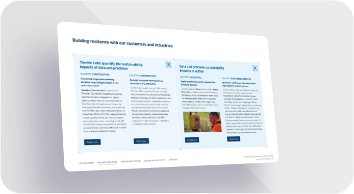 Building resilience with our customers and industries Trimble Labs quantify the sustainability Data and precision sustainability impacts of data and precision impacts in action INDUSTRY: CONSTRUCTION INDUSTRY: CONSTRUCTION INDUSTRY: GEOSPATIAL INDUSTRY: POSITIONING SERVICES Connected progressive scanning Assisted horizontal steering drives Digital models help predict vulnerabilities Qualcomm and Trimble help democratize work昀氀ow helps mitigate major errors reduction in CO emissions to natural disasters high-accuracy location services 2 and reduce waste Trimble Labs sought to assess the savings Trimble distributor Korec partnered with Storm In March 2022, Trimble and Qualcomm announced Saunders Construction implemented e昀昀ect on CO2 emissions through reducing Geomatics to address the increased frequency technology that enables superior location Trimble’s Connected Progressive Scanning fuel consumption by using horizontal assisted and severity of natural disasters in recent years. capabilities in premium Android smartphones Work昀氀ow for error mitigation for cast-in- steering technology for soil compactors in the By creating digital models with the precision worldwide. The integration of Trimble RTX GNSS ® place concrete 昀氀oors in the construction of construction industry. Trimble data scientists and accuracy of Trimble technologies, they technology with premium Snapdragon Mobile One River North Residences in Denver. By tested two operators performing a speci昀椀c were able to assess system vulnerabilities and Platforms supercharges Android phones’ positioning leveraging Trimble technology, In partnership assisted steering operation 20 times each. manage assets and resources. abilities. Application developers using Snapdragon with Trimble Labs, they measured a return on Results showed that compactors operated can now provide mobile users with meter-level investment (ROI) of 1,164%—saving time from with assisted steering made fewer passes accuracy (approximately three feet) when used with manual quality control and from estimated with less overlap leading to a 26.46% a Trimble RTX-based correction service. This is a error correction costs—resulting in a 31.2% reduction in fuel consumption, regardless 5X improvement in location accuracy compared to (144 tCO2e) savings in greenhouse gas (GHG) of operator characteristics. today’s typical levels, a key step in driving connected emissions that would have otherwise resulted vehicles and autonomy. Further, this collaboration from materials needed for rework. represents a meaningful contribution to increasing access to high-accuracy location services. Read more Read more Read more Read more INTRODUCTION BUILDING RESILIENCE EMPOWERING PEOPLE LEADING WITH INTEGRITY APPENDIX Trimble Sustainability Report 2022 Page 19 ©2023, Trimble Inc. All rights reserved.