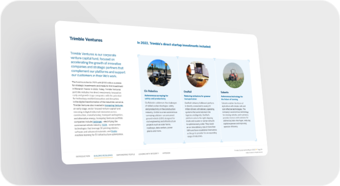 Trimble Ventures In 2022, Trimble’s direct startup investments included: Trimble Ventures is our corporate venture capital fund, focused on accelerating the growth of innovative companies and strategic partners that complement our platforms and support our customers in their life’s work. The fund launched in 2021 with $200 million available for strategic investments and made its 昀椀rst investment in Monarch Tractor in 2021. Today, Trimble Ventures’ Civ Robotics OneRail Sabanto portfolio includes 昀椀ve direct investments focused on early and growth stage companies with the potential Autonomous surveying for Reducing emissions for greener Autonomous technology for for technology-enabled innovation and disruption safety and productivity transportation the future of farming in the digital transformation of the industries we serve. Civ Robotics addresses the challenges OneRail’s delivery ful昀椀llment platform Sabanto enables the future of Trimble Ventures also invested in Ironspring Ventures, of skilled worker shortages, safety is directly connected to nearly 10 agriculture with simple, safe and an early stage, sector focused venture capital fund and productivity in the construction million drivers with delivery operating cost-e昀昀ective technologies. The investing in digital industrial innovation across industry. CivDot is a new autonomous systems that automate last mile company’s autonomous technology construction, manufacturing, transport and logistics, surveying solution—an unmanned logistics intelligently. OneRail’s for existing vehicles and machinery and alternative energy. Ironspring Ventures portfolio ground vehicle (UGV) designed for platform selects the right shipping provides farmers with solutions for companies include Harbinger - electrifying the civil engineering and infrastructure mode and courier or carrier network addressing labor shortages, reducing commercial vehicle industry; ICON - construction projects such as solar farms, to optimize every order. They boast capital expenses and improving technologies that leverage 3D printing robotics, roadways, data centers, power an on-time delivery rate of more than operator e昀케ciency. software and advanced materials; and Stable - plants and more. 98% and have established themselves machine learning for EV infrastructure optimization. as the go-to provider for an expanding range of industries. INTRODUCTION BUILDING RESILIENCE EMPOWERING PEOPLE LEADING WITH INTEGRITY APPENDIX Trimble Sustainability Report 2022 Page 24 ©2023, Trimble Inc. All rights reserved.