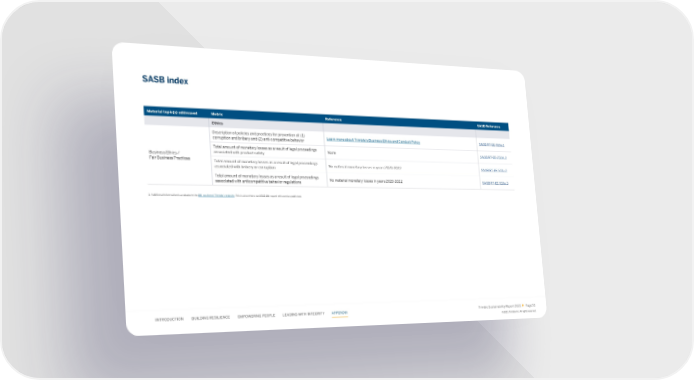 SASB index Material topic(s) addressed Metric Reference SASB Reference Ethics Description of policies and practices for prevention of: (1) Learn more about Trimble’s Business Ethics and Conduct Policy SASB RT-EE-510a.1 corruption and bribery and (2) anti-competitive behavior Total amount of monetary losses as a result of legal proceedings None SASB RT-EE-250A.2 Business Ethics / associated with product safety Fair Business Practices Total amount of monetary losses as a result of legal proceedings associated with bribery or corruption No material monetary losses in years 2020-2022 SASB RT-EE-510a.2 Total amount of monetary losses as a result of legal proceedings No material monetary losses in years 2020-2022 SASB RT-EE-510a.3 associated with anticompetitive behavior regulations 1. Additional information is available in the DEI section of Trimble’s website. This is also where our 2022 DEI report will soon be published. INTRODUCTION BUILDING RESILIENCE EMPOWERING PEOPLE LEADING WITH INTEGRITY APPENDIX Trimble Sustainability Report 2022 Page 55 ©2023, Trimble Inc. All rights reserved.