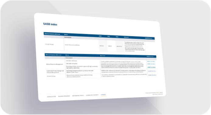 SASB index Material topic(s) addressed Metric 2020 2021 2022 Reference SASB Reference Environment The reduction seen in 2022 is largely the result of the nature and volume of goods and services we purchased in 2022. An increase in travel Climate Change Scope 3 Emissions (mtCO2e) 329,000 186000 168,000.00 however has caused this decrease to be less -- than what it could have been. We aim to keep travel emissions down to half of what they were at pre-pandemic levels. Material topic(s) addressed Metric Reference SASB Reference Environment Total water withdrawn Trimble’s portfolio contributes to sustainable management of water resources. Internal water SASB TC-SI-130a.2 Total water consumed consumption has not yet risen to the level of materiality to justify comprehensive tracking of water SASB TC-SI-130a.2 Natural Resource Management withdrawals and consumption across our operating footprint. We recognize the importance of water Percentage of water consumed in regions with high or extremely resource management as part of our broader natural resource management material topic and are high baseline water stress making strides to enhance our internal management approach, including water use metrics. SASB TC-SI-130a.2 Sustainable Product Design and Percentage of eligible products, by revenue, that meet ENERGY-STAR® criteria are not relevant to Trimble products, sustainable product design and lifecycle Lifecycle Management ENERGY-STAR® management is a key topic that we will continue to focus on in product design and development SASB RT-EE-410a.2 criteria Climate Change Revenue from renewable energy-related and energy Our portfolio contributes to sustainability as a catalyst for enhanced energy e昀케ciency and productivity SASB RT-EE-410a.3 e昀케ciency-related products in diverse industrial sectors. INTRODUCTION BUILDING RESILIENCE EMPOWERING PEOPLE LEADING WITH INTEGRITY APPENDIX Trimble Sustainability Report 2022 Page 53 ©2023, Trimble Inc. All rights reserved.