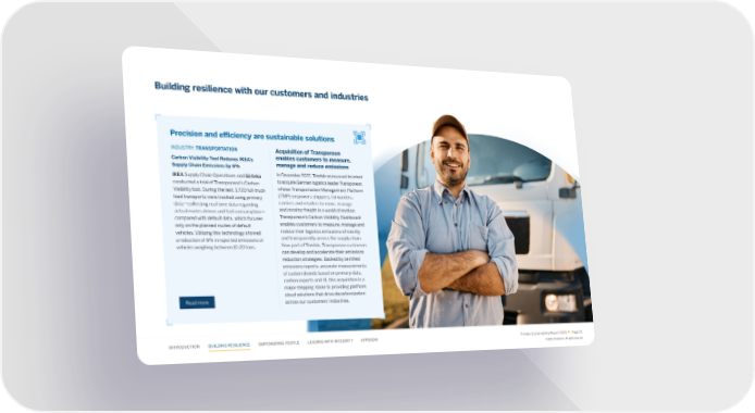 Building resilience with our customers and industries Precision and e昀케ciency are sustainable solutions INDUSTRY: TRANSPORTATION Acquisition of Transporeon Carbon Visibility Tool Reduces IKEA’s enables customers to measure, Supply Chain Emissions by 6% manage and reduce emissions IKEA Supply Chain Operations and Girteka In December 2022, Trimble announced its intent conducted a trial of Transporeon’s Carbon to acquire German logistics leader Transporeon, Visibility tool. During the test, 1,720 full-truck whose Transportation Management Platform load transports were tracked using primary (TMP) empowers shippers, forwarders, data—collecting real-time data regarding carriers and retailers to move, manage actual routes driven and fuel consumption— and monitor freight in a world of motion. compared with default data, which focuses Transporeon’s Carbon Visibility Dashboard only on the planned routes of default enables customers to measure, manage and vehicles. Utilizing this technology showed reduce their logistics emissions e昀케ciently a reduction of 6% in reported emissions of and transparently across the supply chain. vehicles weighing between 10-20 tons. Now part of Trimble, Transporeon customers can develop and accelerate their emissions reduction strategies. Backed by certi昀椀ed emissions reports, accurate measurements of carbon dioxide based on primary data, carbon experts and AI, this acquisition is a major stepping stone to providing platform cloud solutions that drive decarbonization Read more across our customers’ industries. INTRODUCTION BUILDING RESILIENCE EMPOWERING PEOPLE LEADING WITH INTEGRITY APPENDIX Trimble Sustainability Report 2022 Page 22 ©2023, Trimble Inc. All rights reserved.