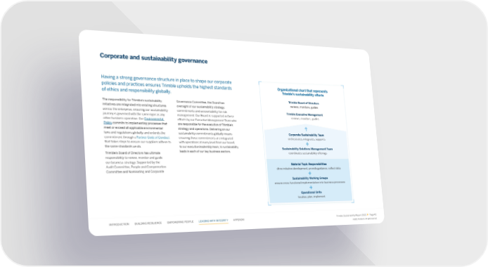 Corporate and sustainability governance Having a strong governance structure in place to shape our corporate policies and practices ensures Trimble upholds the highest standards Organizational chart that represents of ethics and responsibility globally. Trimble’s sustainability e昀昀orts Trimble Board of Directors The responsibility for Trimble’s sustainability Governance Committee, the Board has reviews, monitors, guides initiatives are integrated into existing structures oversight of our sustainability strategy, across the enterprise, ensuring our sustainability commitments and accountability for risk Trimble Executive Management journey is governed with the same rigor as any management. Our Board is supported in these reviews, monitors, guides other business operation. Our Environmental e昀昀orts by our Executive Management Team who Policy commits to implementing processes that are responsible for the execution of Trimble’s meet or exceed all applicable environmental strategy and operations. Delivering on our laws and regulations globally, and extends the sustainability commitments globally means Corporate Sustainability Team commitment through a Partner Code of Conduct ensuring those commitments are integrated orchestrates, integrates, supports that takes steps to ensure our suppliers adhere to with operations at every level from our board, the same standards we do. to our executive leadership team, to sustainability Sustainability Solutions Management Team Trimble’s Board of Directors has ultimate leads in each of our key business sectors. coordinates sustainability o昀昀erings responsibility to review, monitor and guide our business strategy. Supported by the Material Topic Responsibilities Audit Committee, People and Compensation drive initiative development, provide guidance, collect data Committee and Nominating and Corporate Sustainability Working Groups ensure cross-functional implementation into business processes Operational Units localize, plan, implement INTRODUCTION BUILDING RESILIENCE EMPOWERING PEOPLE LEADING WITH INTEGRITY APPENDIX Trimble Sustainability Report 2022 Page 42 ©2023, Trimble Inc. All rights reserved.