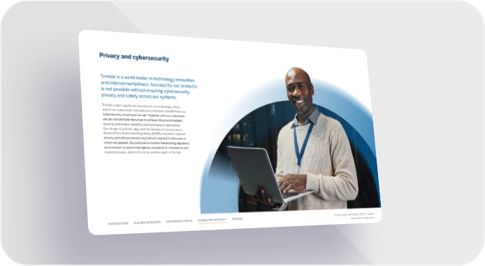 Privacy and cybersecurity Trimble is a world leader in technology innovation and interconnectedness. Success for our products is not possible without ensuring cybersecurity, privacy and safety across our systems. Trimble makes signi昀椀cant investments in technology safety across our value chain, ensuring our customers bene昀椀t from our cybersecurity investment as well. Together with our customers, we can concentrate resources to achieve robust and resilient security and ensure reliability and continuity of operations. Our design standards align with the European Commission’s General Data Protection Regulation (GDPR) and other regional privacy and data protection regulations relevant to the areas in which we operate. We continue to monitor the evolving regulatory environment to ensure the highest standards of compliance and implementation, both to the letter and the spirit of the law. INTRODUCTION BUILDING RESILIENCE EMPOWERING PEOPLE LEADING WITH INTEGRITY APPENDIX Trimble Sustainability Report 2022 Page 44 ©2023, Trimble Inc. All rights reserved.