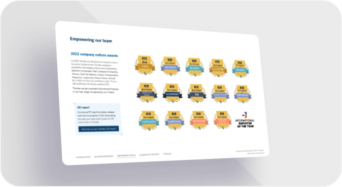 Empowering our team 2022 company culture awards In 2022, Trimble won 14 awards in company culture based on feedback from Trimble employees provided to the leading culture and compensation platform Comparably: Best Company for Diversity, Women, Work-life Balance, Culture, Compensation, Happiness, Leadership, Global Culture, Outlook, Best CEOs for Diversity and Women, Best Teams HR and Product & Design and Best CEO. Trimble was also awarded International Employer of the Year (large companies) by JCI Finland. DEI report Our annual DEI report provides a deeper look into our progress in DEI, showcasing the ways our vision and mission for DEI come to life at Trimble. Click here to see Trimble’s DEI report INTRODUCTION BUILDING RESILIENCE EMPOWERING PEOPLE LEADING WITH INTEGRITY APPENDIX Trimble Sustainability Report 2022 Page 33 ©2023, Trimble Inc. All rights reserved.