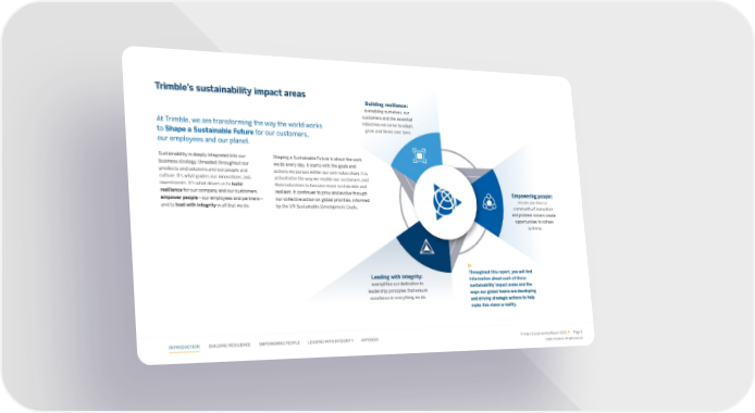 Trimble’s sustainability impact areas Building resilience: is enabling ourselves, our customers and the essential At Trimble, we are transforming the way the world works industries we serve to adapt, to Shape a Sustainable Future for our customers, grow and thrive over time. our employees and our planet. Sustainability is deeply integrated into our Shaping a Sustainable Future is about the work business strategy, threaded throughout our we do every day. It starts with the goals and products and solutions and our people and actions we pursue within our own value chain. It is culture. It’s what guides our innovations and activated in the way we enable our customers and investments. It’s what drives us to build their industries to become more sustainable and resilience for our company and our customers, resilient. It continues to grow and evolve through Empowering people: empower people—our employees and partners— our collective action on global priorities, informed means our diverse and to lead with integrity in all that we do. by the UN Sustainable Development Goals. community of innovators and problem solvers create opportunities for others to thrive. Leading with integrity: Throughout this report, you will 昀椀nd exempli昀椀es our dedication to information about each of these leadership principles that ensure sustainability impact areas and the excellence in everything we do. ways our global teams are developing and driving strategic actions to help make this vision a reality. INTRODUCTION BUILDING RESILIENCE EMPOWERING PEOPLE LEADING WITH INTEGRITY APPENDIX Trimble Sustainability Report 2022 Page 6 ©2023, Trimble Inc. All rights reserved.