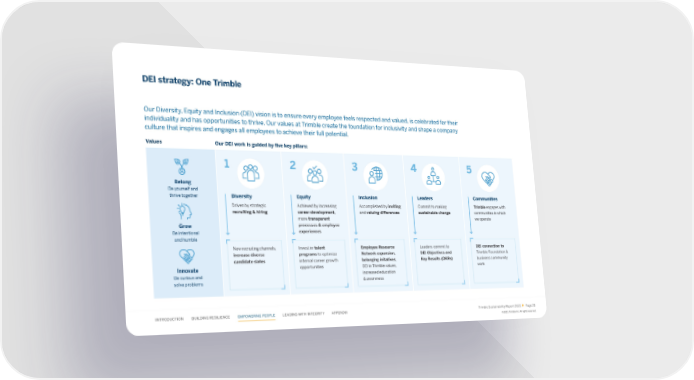 DEI strategy: One Trimble Our Diversity, Equity and Inclusion (DEI) vision is to ensure every employee feels respected and valued, is celebrated for their individuality and has opportunities to thrive. Our values at Trimble create the foundation for inclusivity and shape a company culture that inspires and engages all employees to achieve their full potential. Values Our DEI work is guided by 昀椀ve key pillars: 1 2 3 4 5 Belong Be yourself and thrive together Diversity Equity Inclusion Leaders Communities Driven by strategic Achieved by increasing Accomplished by inviting Commit to making Trimble engages with recruiting & hiring career development, and valuing di昀昀erences sustainable change communities in which more transparent we operate Grow processes & employee Be intentional experiences and humble New recruiting channels, Invest in talent Employee Resource Leaders commit to DEI connection to increase diverse programs to optimize Network expansion, DEI Objectives and Trimble Foundation & candidate slates internal career growth belonging initatives, Key Results (OKRs) business community Innovate opportunities DEI in Trimble values, work Be curious and increased education solve problems & awareness INTRODUCTION BUILDING RESILIENCE EMPOWERING PEOPLE LEADING WITH INTEGRITY APPENDIX Trimble Sustainability Report 2022 Page 28 ©2023, Trimble Inc. All rights reserved.