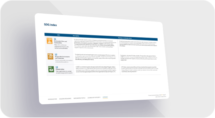 SDG index SDG Description Shaping a sustainable future 11 As natural disaster events increase in frequency and intensity there is increased Trimble technology helps predict vulnerabilities to natural disasters5. Trimble work昀氀ows Sustainable Cities and urgency to undertake resilience planning so communities can identify potential hazards are contributing to the resilience and sustainability of cities and communities by (1) Communities and threats, and establish prevention, adaptation, mitigation, and recovery plans. reducing materials waste from rework and thus (2) reducing the overall carbon footprint Trimble solutions are used during construction and infrastructure projects globally. of buildings6. Make cities and human Our products make cities and communities safer, more resilient, and have fewer settlements inclusive, safe, negative impacts on the environment. resilient and sustainable 12 Trimble has set science-based targets which include engaging 70% of our suppliers Transporeon, now part of Trimble, provides a Transportation Management Platform Responsible Consumption in setting their own science-based targets by 2026. Through our technology, we also (TMP) that includes a Carbon Visibility Dashboard that enables customers to measure, and Production optimize and streamline logistics across global supply chains with an eye for greater manage and reduce their logistics emissions e昀케ciently and transparently across the 7 fuel e昀케ciency and 昀氀eet performance. supply chain . Ensure sustainable consumption and production patterns 13 In 2022, our emissions goals were approved by the Science Based Targets Initiative At Trimble, we serve some of the world’s key industries that represent some of the Climate Action (SBTi) and put us on a path toward reducing emissions by 50% by 2030. We are also greatest opportunities to accelerate sustainable outcomes by taking action on climate working to ensure 70% of our suppliers set science-based targets by 2026. Together, change. Many of Trimble’s solutions enable our customers to accelerate sustainable Take urgent action to combat we can all achieve goals aligned with the Paris Agreement to keep warming to 1.5°C. outcomes by reducing emissions4, 6. climate change and its impacts INTRODUCTION BUILDING RESILIENCE EMPOWERING PEOPLE LEADING WITH INTEGRITY APPENDIX Trimble Sustainability Report 2022 Page 57 ©2023, Trimble Inc. All rights reserved.