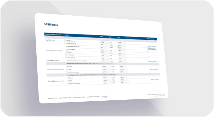 SASB index Material topic(s) addressed Metric 2020 2021 2022 Reference SASB Reference Talent Attraction Global Employees 11,402 11,815 11,825 -- % Employees in U.S. 44% 43.5% 44.0% SASB TC-SI-330a.1 % Employees outside U.S. 56% 56.5% 56.0% SASB TC-SI-330a.1 % North America 49% 49% 48% -- Diversity, Equity and Inclusion % Europe 30% 30% 30% -- % Asia Paci昀椀c 17% 17% 18% -- % Rest of World 4% 4% 4% -- Employee Engagement Employee engagement as a percentage 82% 83% 83% SASB TC-SI-330a.2 Percentage of gender representation for Senior Management (all Directors and Executives) % Female 18.0% 19.4% 19.60% 1 % Male 82.0% 80.5% 80.30% SASB TC-SI-330a.3 Diversity, Equity and Inclusion % Choose not to state 0.0% 0.2% 0.10% Percentage of gender representation for Management (all Executives, Directors and Managers) % Female 21.1% 22.7% 24.5% 1 % Male 78.8% 77.2% 75.4% SASB TC-SI-330a.3 Diversity, Equity and Inclusion % Choose not to state 0.1% 0.1% 0.1% INTRODUCTION BUILDING RESILIENCE EMPOWERING PEOPLE LEADING WITH INTEGRITY APPENDIX Trimble Sustainability Report 2022 Page 49 ©2023, Trimble Inc. All rights reserved.