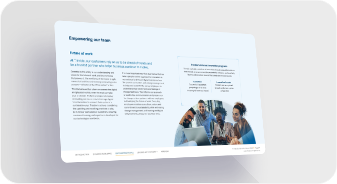 Empowering our team Future of work At Trimble, our customers rely on us to be ahead of trends and Trimble’s internal innovation programs be a trusted partner who helps business continue to evolve. Trimble cultivates a culture of innovation through annual hackathons that include an environmental sustainability category, and quarterly Essential to this ability is our understanding and It is more important now than ever before that we Technical Innovation Awards that celebrate innovative work. vision for the future of work, and the workforce take a people-centric approach to innovation as that powers it. The workforce of the future is agile, we continue to drive our digital transformation. Hackathon Innovation Awards connected and focused on doing work with greater We provide our leaders with change management Successful Hackathon Finalists are recognized purpose—at home, in the o昀케ce and in the 昀椀eld. training and consistently survey employees to projects go on to have broadly and share a prize Trimble believes that when we connect the digital understand their sentiments and feelings of meaningful business impact of $10,000 and physical worlds, even the most complex change readiness. This informs our approach jobs are easier. We have a unique role to play to leadership, communication and preparation in enabling our customers to leverage digital for change as true partners with our employees transformation to connect their systems in in developing the future of work. Every day, sustainable ways. Trimble is actively considering employees maintain our culture, values and the upskilling and reskilling practices at play commitment to sustainability while embracing both for our team and our customers, ensuring change management, skill training and digital continued training and expertise is developed for enhancements across our business units. our technologies worldwide. INTRODUCTION BUILDING RESILIENCE EMPOWERING PEOPLE LEADING WITH INTEGRITY APPENDIX Trimble Sustainability Report 2022 Page 34 ©2023, Trimble Inc. All rights reserved.